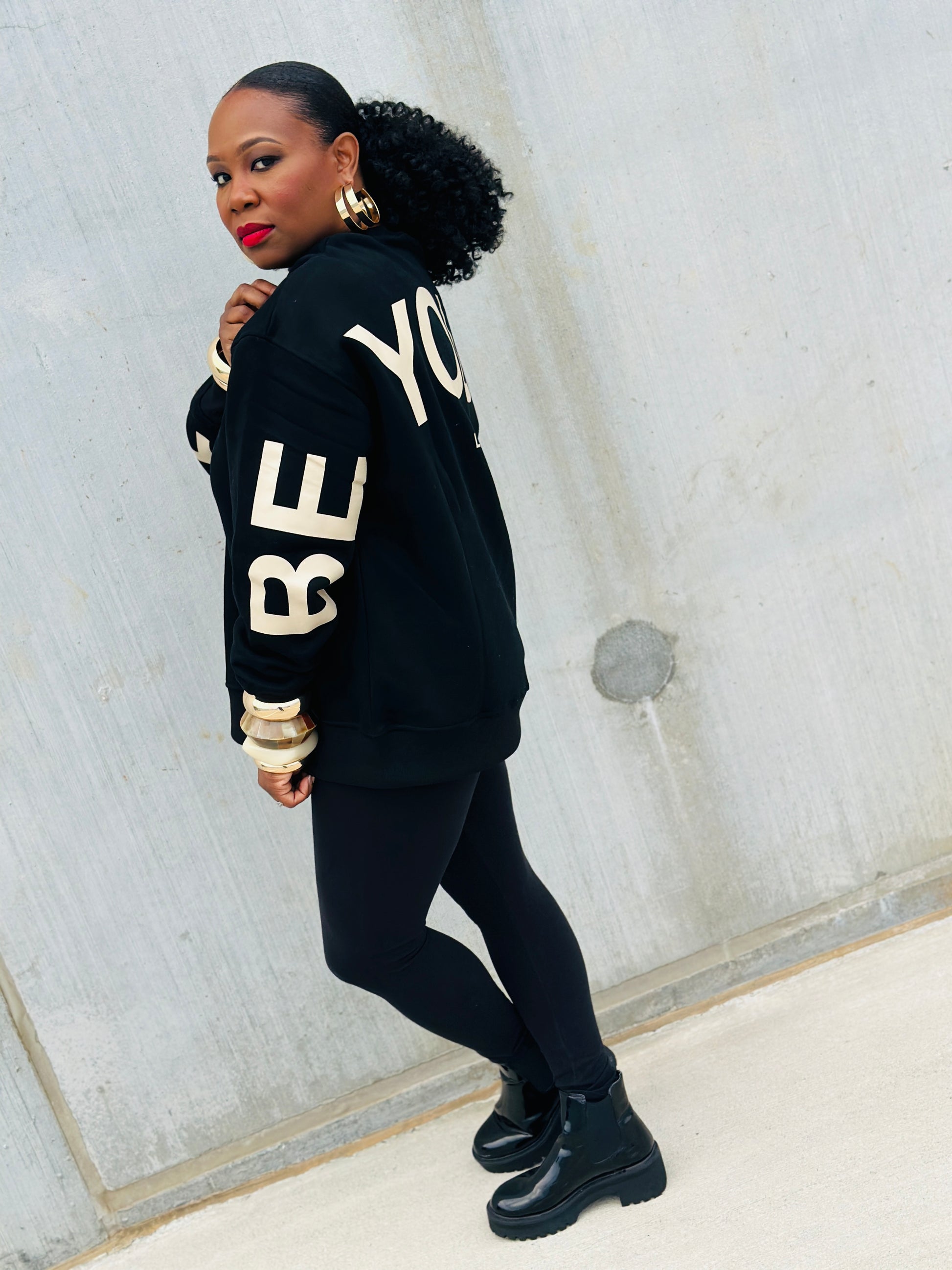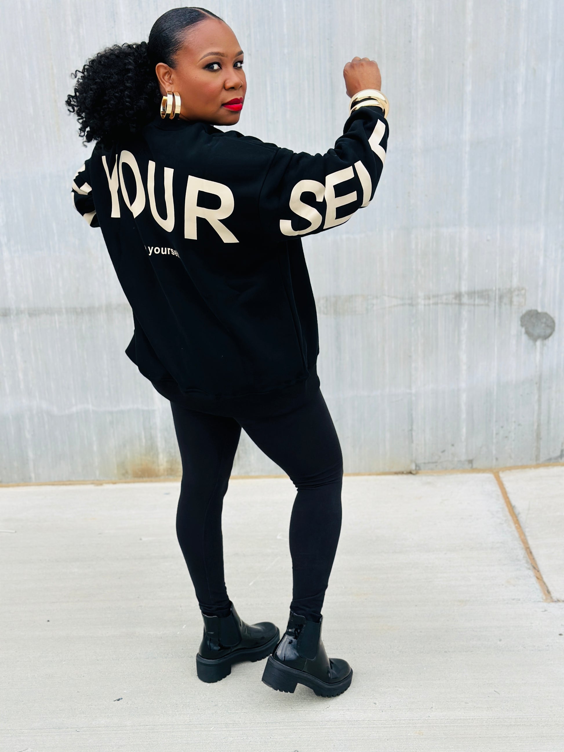 Get comfortable and make a statement with our Be Yourself Sweatshirt! Made with premium material, this oversized sweatshirt features a detailed back print of the empowering message, 'Be Yourself, Love Yourself'. Embrace your unique self and stand out in style with this positive and playful piece.