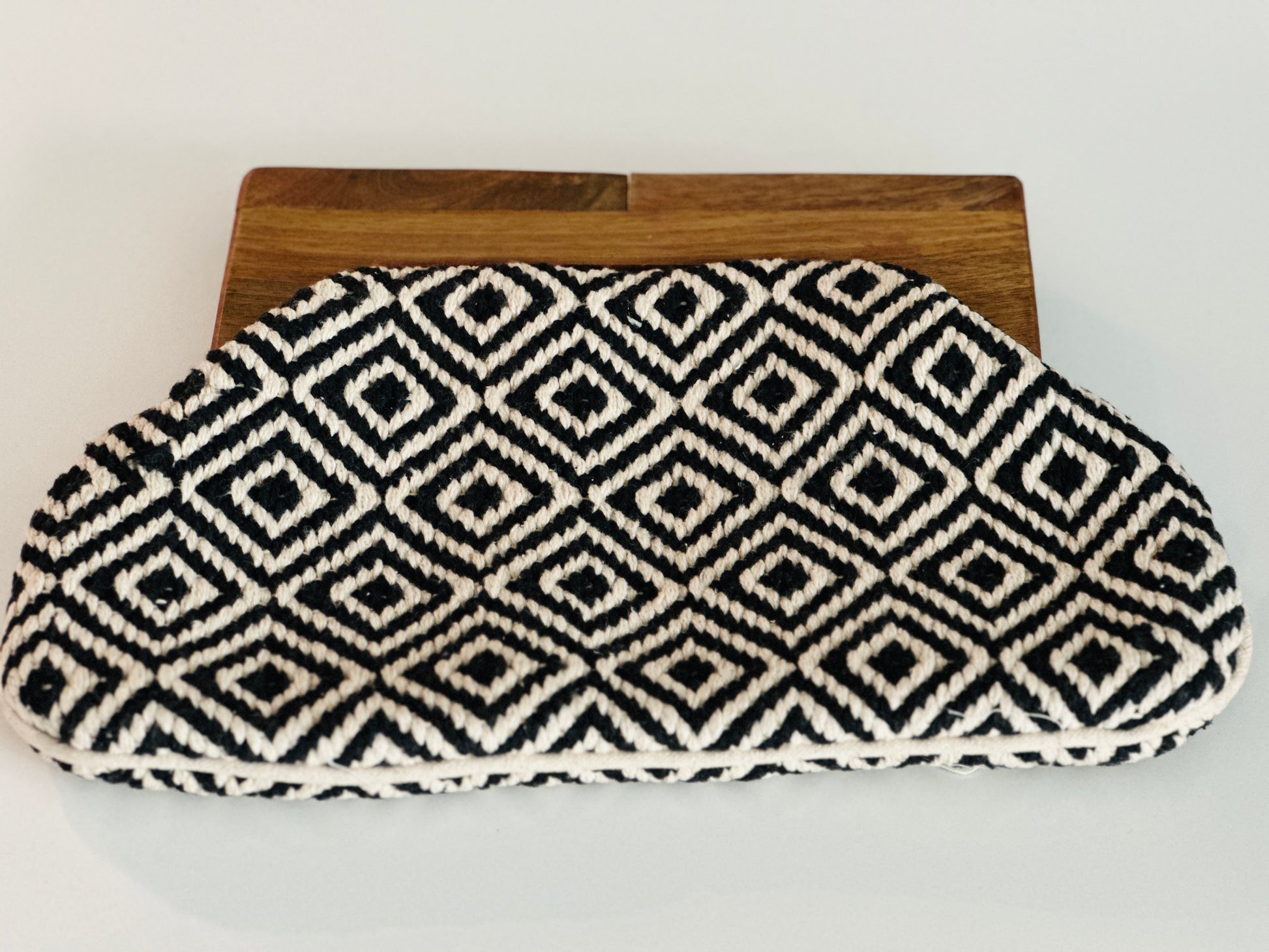 Add some edge to your outfit with our Black Diamond Clutch Bag! This unique bag features a black and white design, perfect for any occasion. The wooden handle adds a touch of natural beauty to this sleek accessory. Stand out from the crowd with this one-of-a-kind bag!