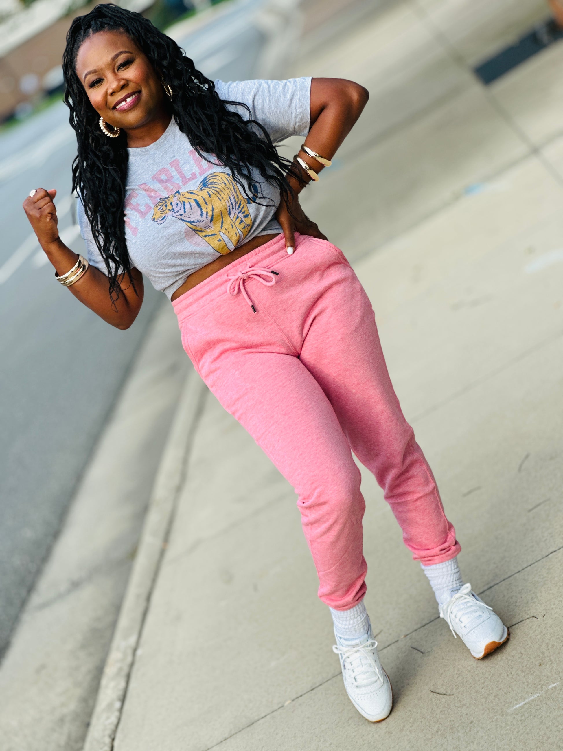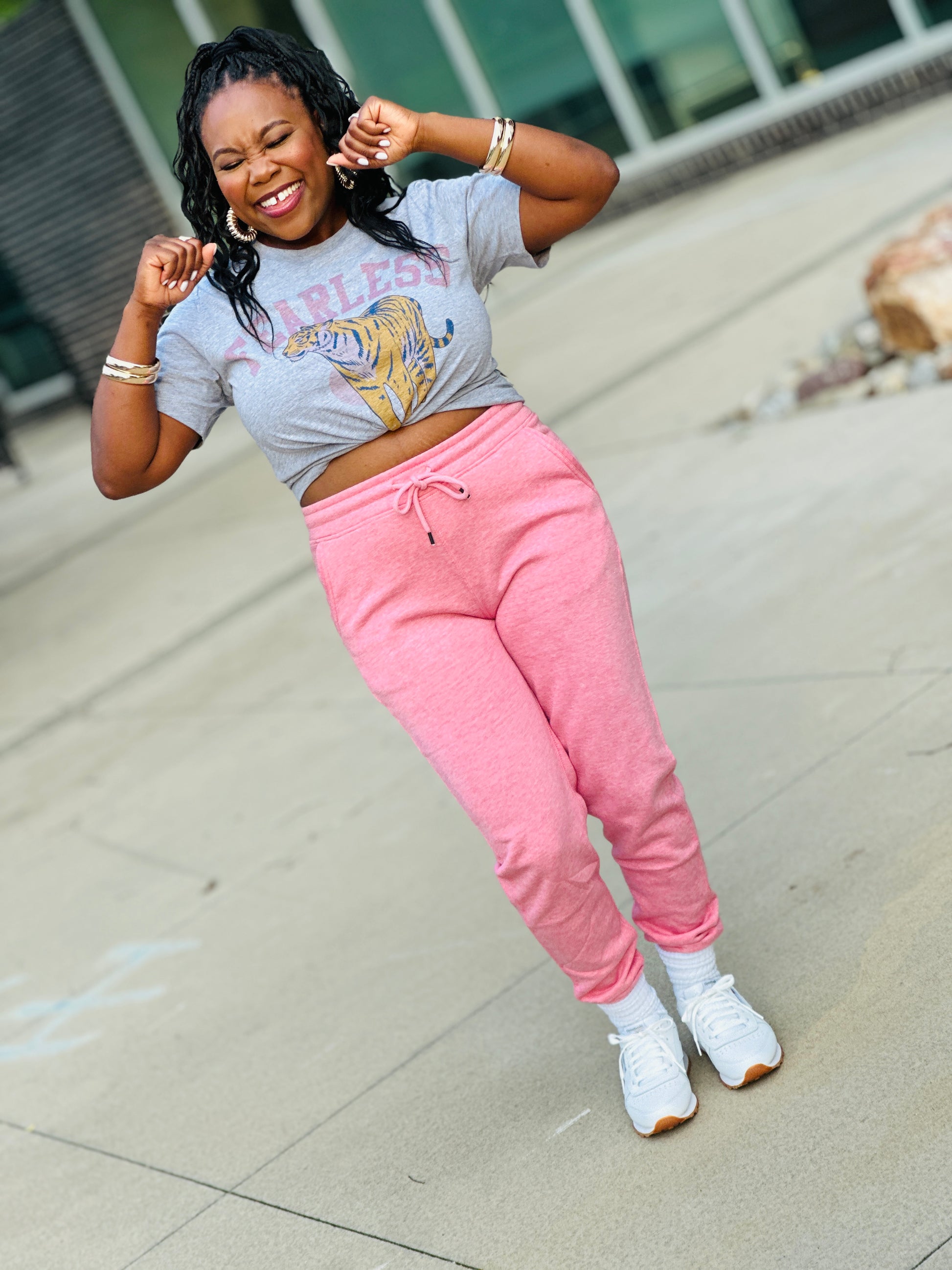 Add some cheerful vibes to your wardrobe with our Pretty in Pink Pants! Made with cozy fleece material, these joggers feature side pockets and an adjustable drawstring for maximum comfort. Perfect for lounging or a casual day out. Pssst...they match perfectly with our Livin Fearless Tee!
