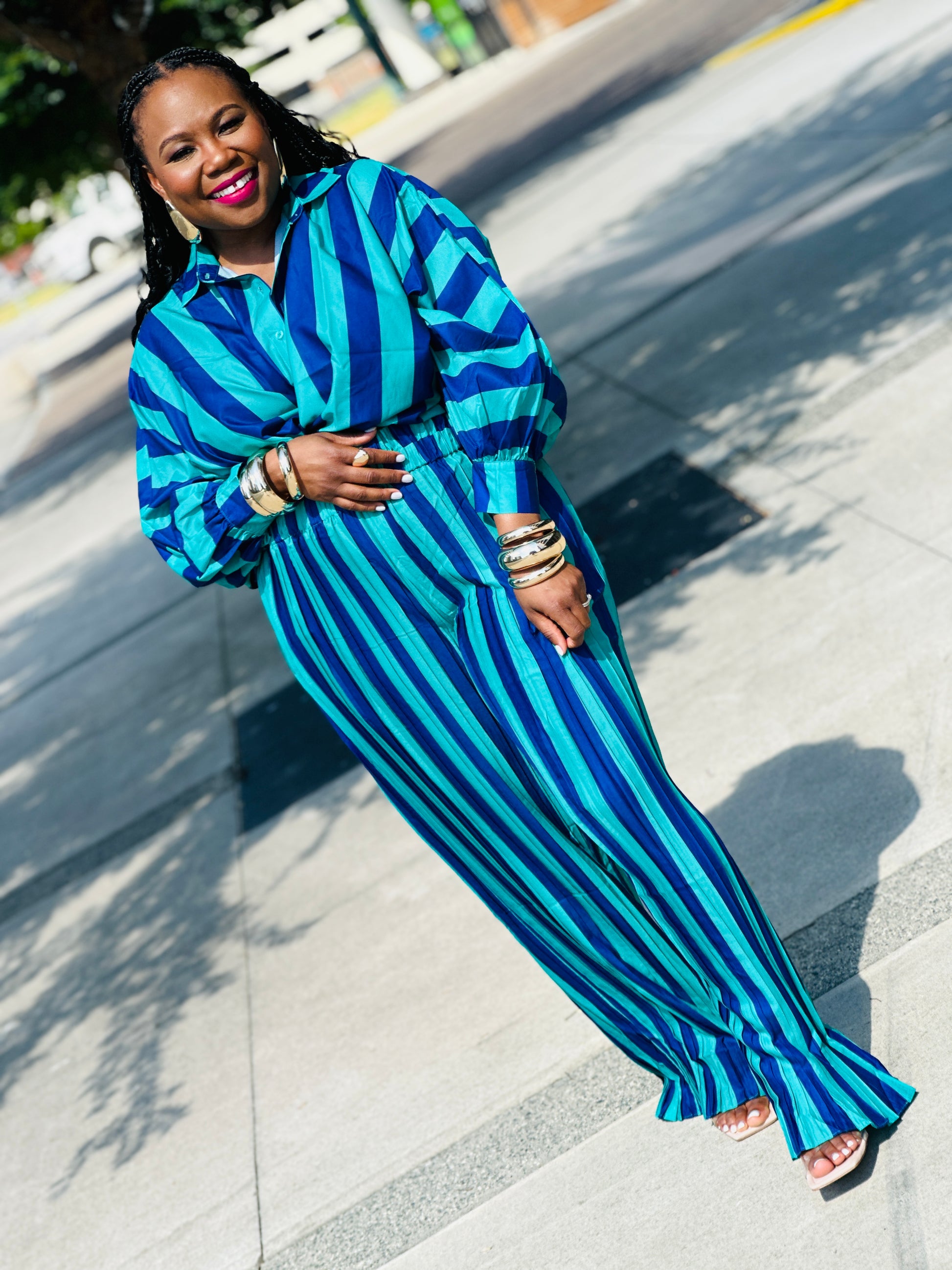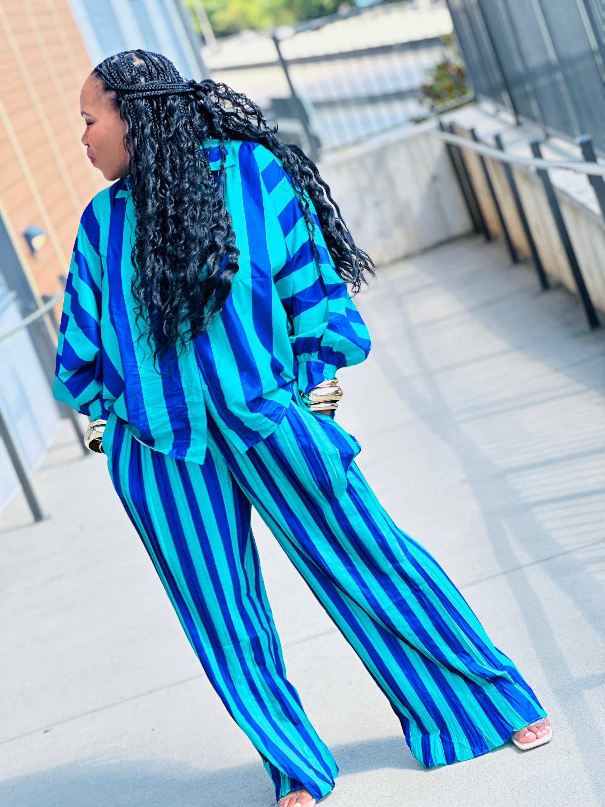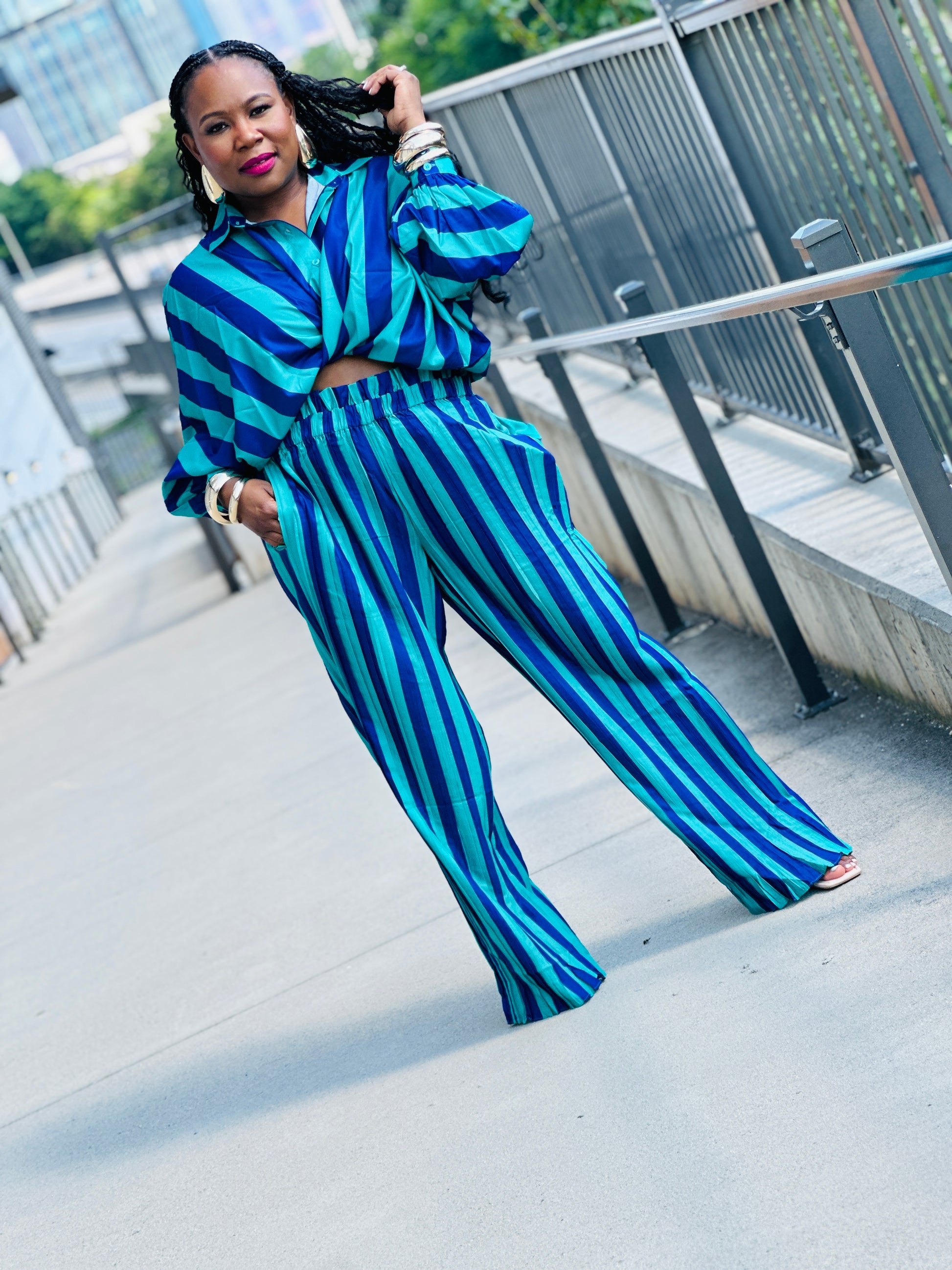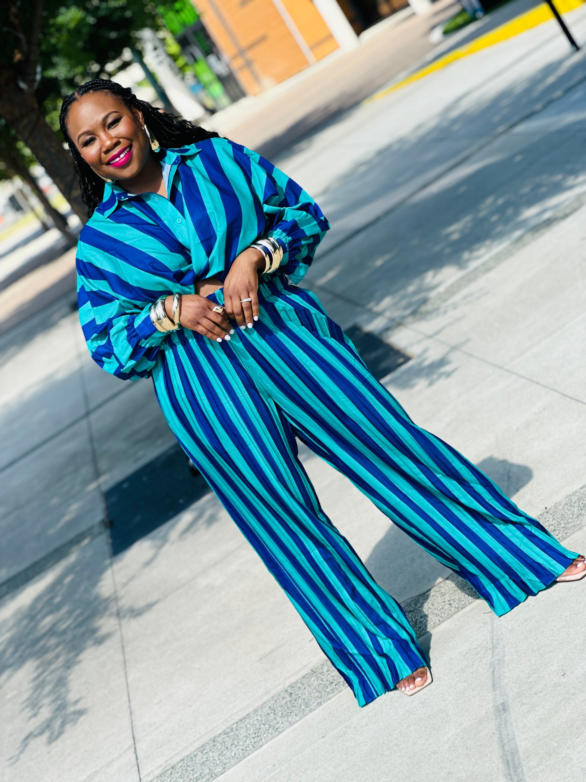Get ready to take your outfit game to the next level with our Stripes on Stripes set! Featuring a stylish long sleeve shirt and pleated pants, this set is perfect for any occasion. The elastic waist ensures a comfortable fit, making it a must-have addition to your wardrobe. Upgrade your style with Stripes on Stripes today!